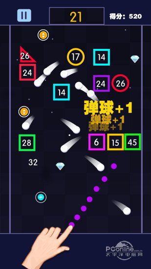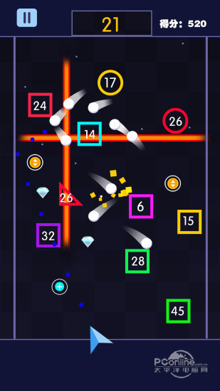 3.每次弹珠击打一次方块都会获得分数,在方块到达底端前尽可能的获取高分。