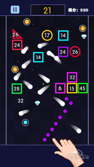 2.利用弹珠以合理的角度消除不断下降的数字方块