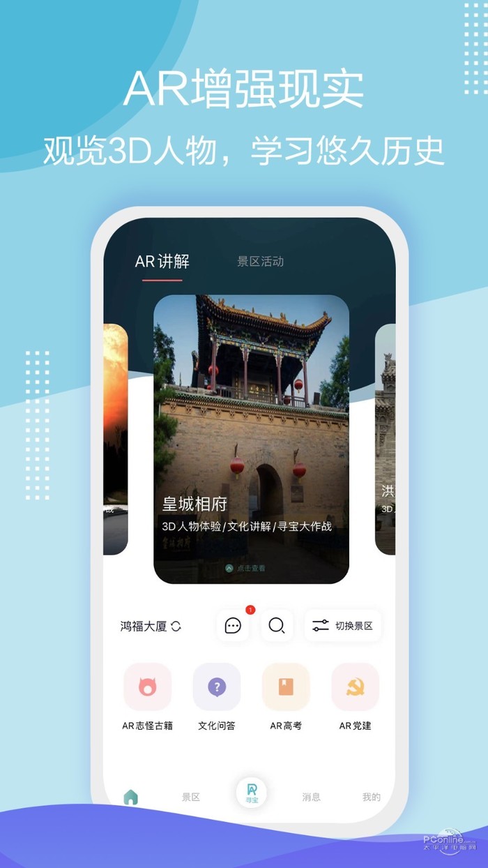 1.AR寻宝-进入后,到相应景点扫描场景,出现虚拟导游(3D历史人物)进行讲解景点.