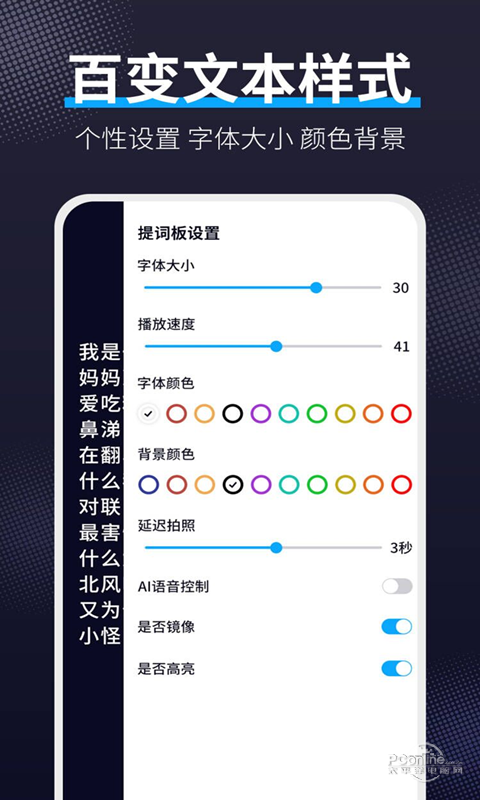 2.AI提词板,让台词跟着您的语速走,您可以随意的快、慢、停,告别传统提词器的机械和呆板,享受自然和自由.同时支持横屏/竖屏提词,支持多种视频规格、自定义颜色、透明度、大小、位置等.