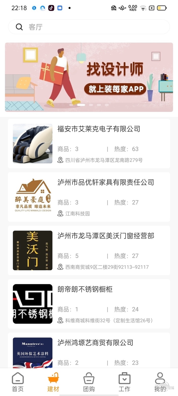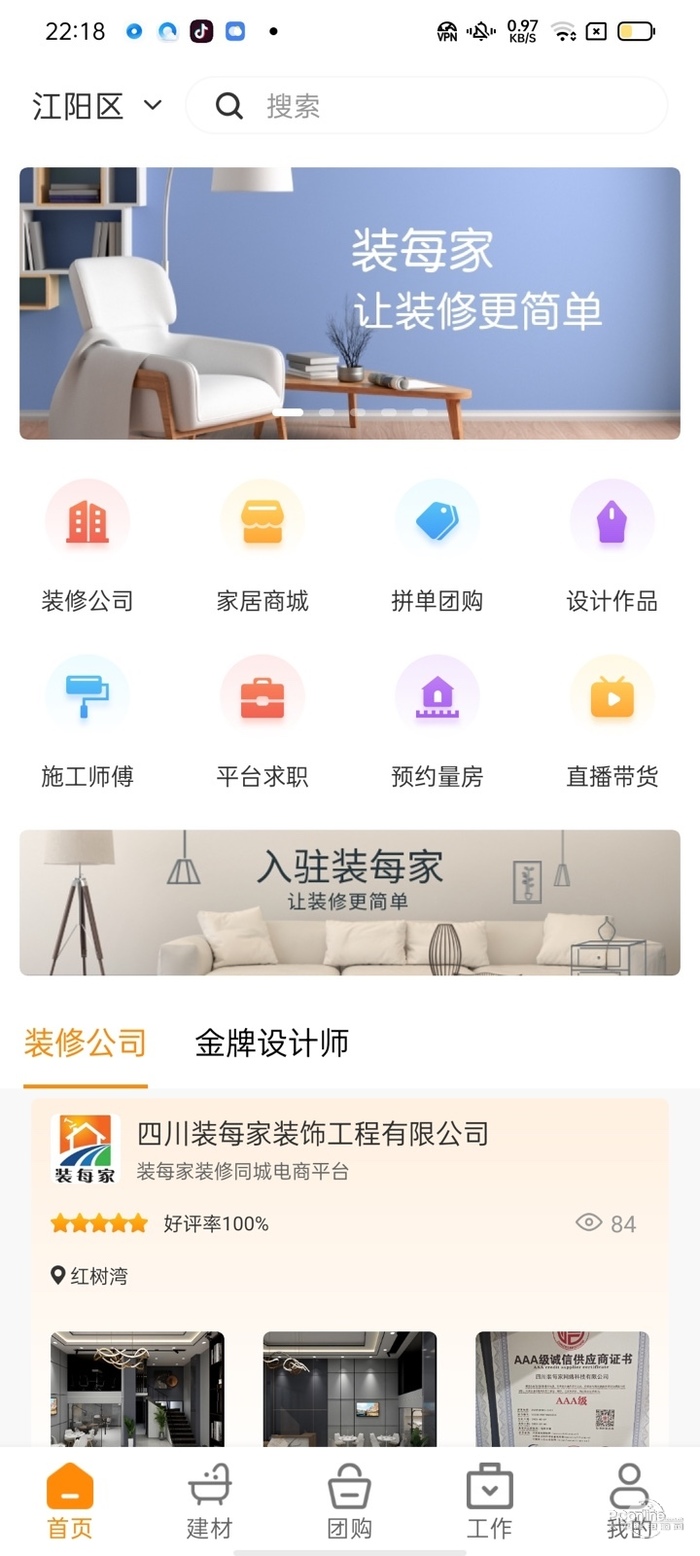 我们的目标就是找装修,找建材家居,找工人,找设计,就上装每家APP.我们愿景是把装每家APP打造成为一款线上线下相结合的装修网络服务品牌.
