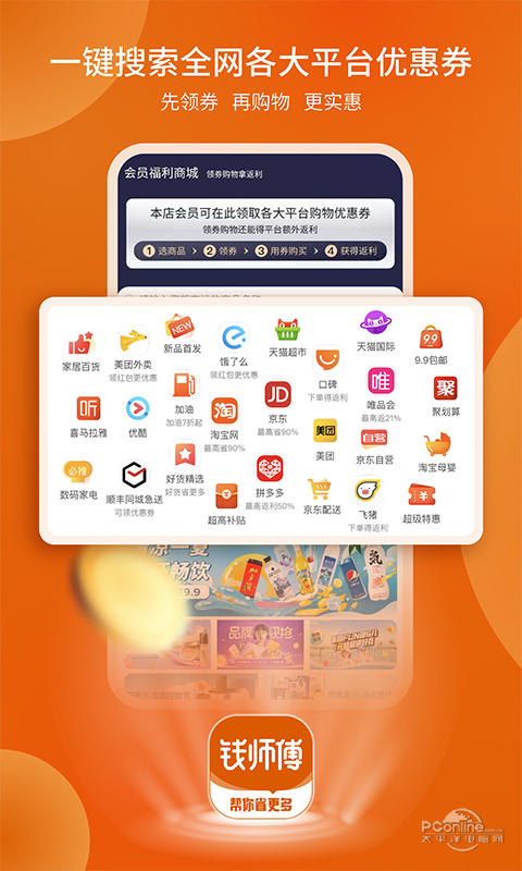 【网购省】已对接淘宝、天猫、京东、唯品会、拼多多等电商,会员可领取各大电商额优惠券到相应App购物使用,享受会员额外优惠福利.一站式逛遍各大电商,省时省心省力~