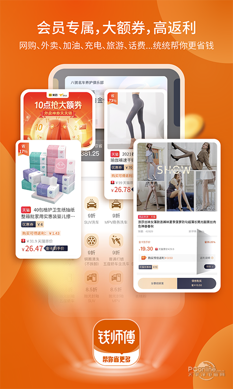 钱师傅,是一个让你干啥都能更省钱的车主福利App.钱师傅,通过大数据汇总对接各大电商优惠信息,涵盖衣、食、住、行、游、用、娱、购等用车、养车、生活的方方面面.让你养车省、用车省、外卖省、充会员省、加油省、充电省、游戏省、旅游省……