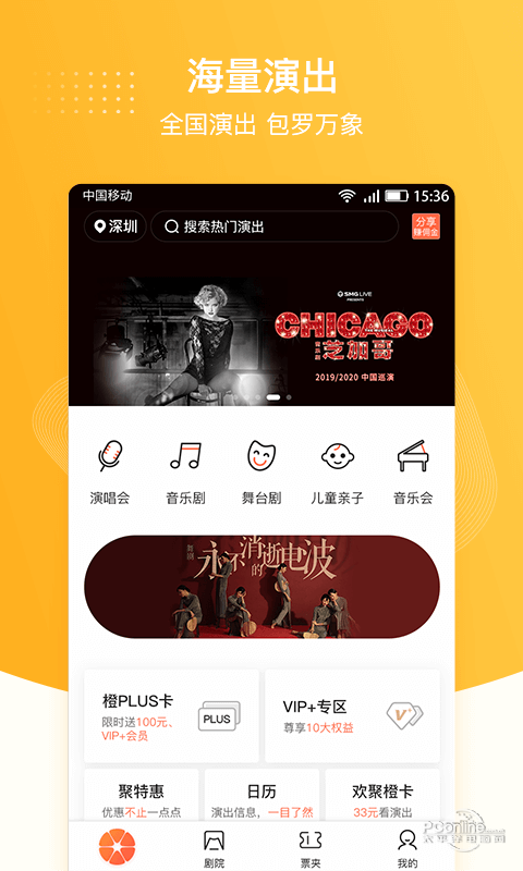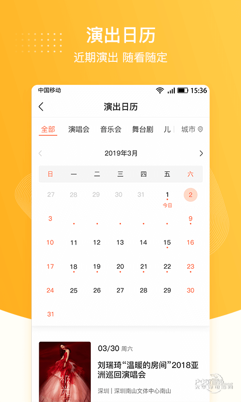 聚橙票务APP,一个专业的移动票务平台,以 F-3C全产业链布局经营模式,立足于专业演出经纪平台,借助聚橙网主办优势,专注于为客户提供众多类别演出订票服务. 聚橙票务APP可购众多类别演出票: 流行演唱会、音乐剧、戏曲、戏剧、舞蹈、儿童剧、亲子活动、网络综艺、艺术展览、古典音乐、小流行音乐、旅游演艺等