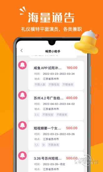 上畅赞,自由职业者一站式服务平台,海量真实安全兼职信息畅赞作为自由职业者一站式服务平台,运用互联网科技手段打通线上和线下的渠道,整合上中下游产业链,解决灵活就业难、灵活用工难的痛点,致力于通过直播、知识分享、创意微短剧赋能等生态体系,让每个人的技能价值最大化变现 1. 自由职业服务平台 海量通告任你挑选【求职招聘贴心服务】365*24小时海量通告、人才实时推荐【全国通告职位速配】心仪职位任你挑选,极速匹配 2.报酬日结自由灵活 平台监管安全可靠【劳动报酬当日结算】薪酬结算不拖拉,自由灵活当日可结【用户权益全程保障】平台建立完善的监管机制,保障合法权益 3.和用工方直接畅聊 人工审核更有保障【在线畅聊找好工作】开启畅聊与用工方直接沟通,省心又省力【通告直招人工认证】平台直招人工审核认证,确保通告真实性 4.礼仪模特平面演员 各类兼职应有尽有【自由职业类型齐全】影视、活动、文娱各类自由职业应有尽有【合适职位及时推送】平台AI算法智能推荐岗位,减少时间成本 5.短剧展示才艺技能 轻松获得更多机会【优势特长尽情展示】短剧展示才艺技能,让世界看到你的精彩瞬间