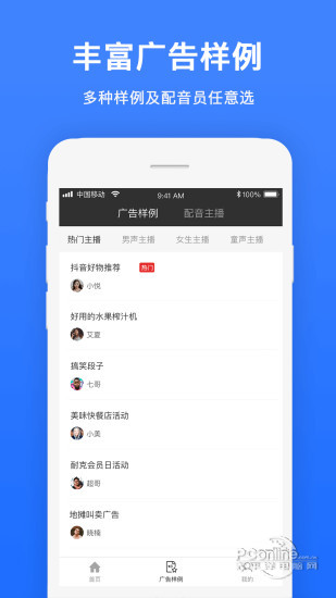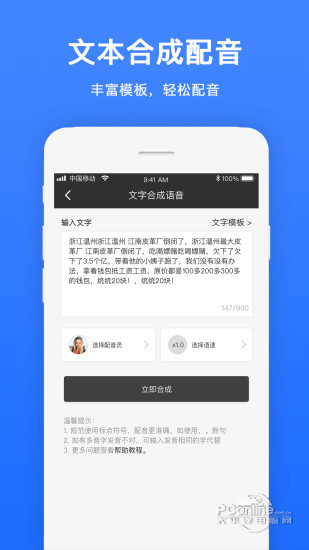 一键语音合成:文字秒转语音,自动化合成。 海量广告模板:广告促销,地摊叫卖,美食餐厅,产品宣传等众多行业模板任您选择。多个合成主播:多达30位智能语音合成机器人,男声+女声+童声随意切换,多种发音人任您选择 一键导出MP3:所有的音频文件都可以直接导出至手机,U盘,离线播放超多声音大咖在配音秀 看看配音高手们的作品,萝莉音、御姐音、少年音等等,各色声线应有尽有,每天都可挖到新的宝藏声音! 用你的声音做大片 看着不过瘾?自己也来玩玩,每天更新超多优质素材,加上便捷的配音功能,让你轻松搞定一部属于自己的声音大作!