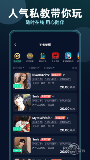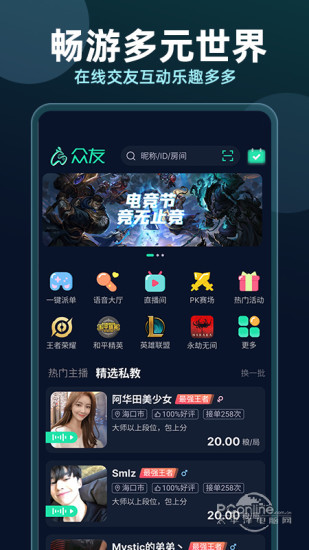 众友电竞是年轻人都在玩的电竞APP。游戏连麦、匹配组队PK、直播娱乐、电竞娱乐等多种游戏娱乐互动场景。心动时刻、在线速配,处CP、找知己就上众友电竞,认识一群声音超甜、游戏贼六的好友! 主要功能: 1、【一键参赛】内置海量比赛,线上报名即可,一键拉起赛事房间,指间比赛无阻碍,海量奖励任君拿! 2、【游戏陪伴】覆盖英雄联盟、王者荣耀、绝地求生、和平精英等热门游戏,根据你的游戏类型和风格,极速匹配到声音好听、技术超强的小姐姐小哥哥们一起玩游戏,玩什么都有人陪~ 3、【视频直播】众友电竞是每个人的直播平台,在众友你可以随时随地开启直播,你想看的都在这里,了解真实的世界,认识有趣的人,也可以记录真实而有趣的自己。 4、【心动时刻】心动时刻,左滑不喜欢,右滑心动,配对无骚扰,选择由自己。即时聊天,高效配对,心动的人秒回你。 5、【在线速配】快速组局,集结上分小队个性游戏卡片,精准匹配兴趣队友有默契,上分更轻松。