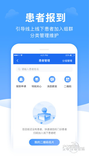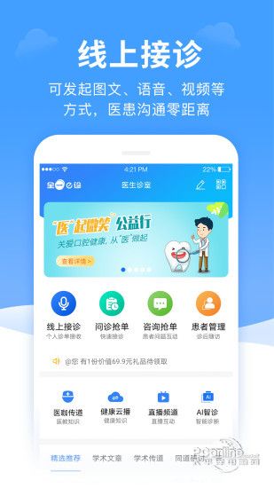 医生专属在线虚拟诊室 “全一e诊”是全一医疗集团建设的移动医疗科技平台,全一e诊致力于为医生建立专属在线虚拟诊室,为医患两端提供智能化、便捷化的诊前,诊中,诊后一站式管理型健康医疗服务的专业平台。全一e诊依托互联网信息平台和移动医疗技术以及AI技术,打造无障碍医患沟通渠道,为医生免费提供属于医生个人专属的在线虚拟诊室。功能体系:线上接诊:为患者提供在线的图文、视语线上问诊服务咨询平台:为居民提供多样化的咨询建议,一问多答,医患互动患者管理:患者报到、复诊提醒、诊后随访、健康宣教等;医生对咨询过、线下导入患者进行标记备注分组和诊后随访跟踪病情,打造医生个人的患者管理体系;在医患圈子中,提供专业健康知识科普,开展患者健康教育,提升医生个人品牌医教知识:医教活动线上化,在平台上的医生资源圈中,获取多样化、多形式的医教知识与专科培训提升,医咖传道,实现同行间的交流与学习。