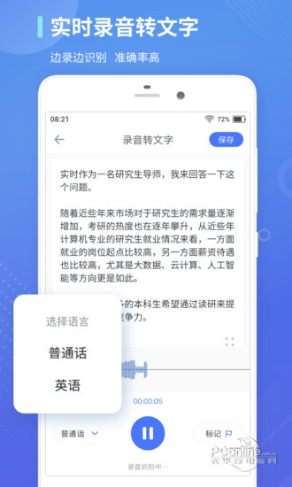 录音转文字通(录音机)是一款集录音、文字转语音、录音转文字、音频转文字、音频格式转换、音频提取器、录音剪辑等为一体的实用性录音转文字工具。它能够实时录音转文字,具有准确的人声识别功能,迅速将录音、语音转换文字、进行录音剪辑,操作十分便捷。应用功能: 1.「实时录音转文字」 支持普通话和英语两种模式的实时录音转文字、录音识别、语音识别等。 2.「录音剪辑」 支持一键录音、手机录音、录音机、语音备忘录、会议录音、演讲录音、采访录音等; 同时支持对录音内容进行实时录音裁剪、录音剪辑等。 3.「文字转语音」 支持文字转语音,多种文案素材(挫折、摘抄、教育、励志、网梗)等随你选,支持多种文字变声朗读,同时支持WAV、MP3等格式保存音频。 4.「音频格式转换」 支持多种音频格式转换。 5.「音频转文字」 支持从微信、QQ、录音、本地文件等渠道导入音频转文字。 6.「音频提取」 支持音频提取,从各种音、视频文件中将音乐提取出来后一键保存,同时可一键分享。如有问题,请联系我们:moreapps.service@gmail.com
