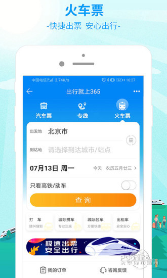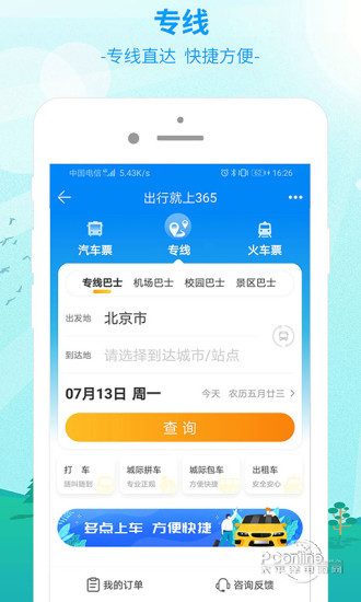 出行365产品介绍:【主要功能】汽车票:全国3000多个客运站在线查询、购票,随时随地想go就购;优惠活动轮番上,为您提供超低实惠;部分客运站支持电子客票,无需取票即可进站乘车;专线:与全国多省份正规客运企业合作,无需进站,站外多站点上下车,方便安全快捷;多类型线路,校园巴士、机场巴士、景点巴士,满足不同乘客出行需求!火车票:提供在线购票,时刻表实时查询功能!城际拼车/包车:覆盖国内多个城市,专业司机车接车送,全力保障出行服务,出行无烦恼,旅行更放心。景区门票:专业的景区门票预定平台,提供超实惠的门票预订服务,自动推荐热门景点,让您尽情畅游在各地美景中流连忘返。出行365中国公路客票网已经成为中国领先的互联网+公众旅游出行综合服务平台,提供汽车票、火车票、定制客运等出行服务以及景区景点门票、周边游、酒店等旅游出行服务。为乘客提供一站式出行服务,便捷更贴心。