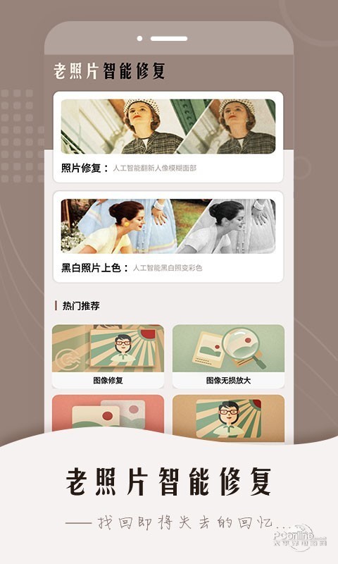 老照片智能修复是一款对残破模糊黑白老照片修复上色的工具,基于领先的AI图像生成技术的在线照片增强软件,将一些珍贵的值得怀念的照片却由于时间久远变得模糊不清,使用照片修复功能,就可以自动修复照片使其清晰度提高,完美还原其本来面貌.