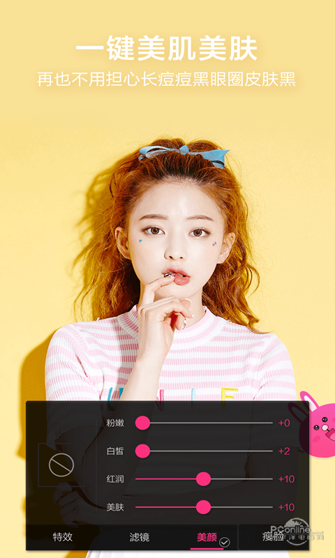 瘦脸、美白、大眼等功能,轻轻一滑自由调节美容程度,实时预览美肤效果,一键保存