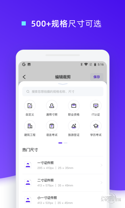 应用内已添加500+种规格尺寸,一寸二寸等常用必备规格、计算机四六级等考试需要规格、签证护照等出行使用规格、驾照社保等日常需求规格......多种证件照场景分类帮助您快速选择,裁剪证件照一秒解决.