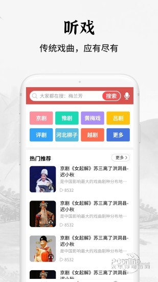 《传统戏曲大全》海量戏曲内容,为您打造了良好看戏,听戏,唱戏,聊戏体验。让你随时随地,想看就看,想听就听,想唱就唱,想聊就聊。戏曲爱好者的必备神器。戏曲是中国传统艺术之一,剧种繁多有趣,表演形式载歌载舞,有说有唱,有文有武,集“唱、做、念、打”于一体,是具有民族特点和风格的艺术样式之一。戏曲多多:《传统戏曲大全》汇集了京剧,越剧,豫剧,黄梅戏,评剧,秦腔,昆曲,沪剧、晋剧、粤剧,淮剧,庐剧,川剧,昆曲,黔剧,莆仙戏,花鼓戏,二人转,梆子戏等全国各地不同戏曲剧种。剧目多多:《传统戏曲大全》包含了红楼梦,徽州女人,沙家浜,红灯记,花木兰,小女婿,牡丹亭,西厢记,穆桂英挂帅,朝阳沟,梁祝,孟姜女,孟丽君,打金枝,贵妃醉酒,铡美案,白蛇传,苏三起解等经典传统名剧,更有央视戏曲内容。名家多多:《传统戏曲大全》涵盖了梅兰芳,程砚秋,尚小云,荀慧生,马连良,施银花,赵瑞花,王杏花,姚水娟,奚啸伯,严凤英,梅葆玖,李世济,李维康,耿其昌,孟广禄,赵葆秀,尚长荣,李海燕,李宏图,刘秀荣,胡小风,苗文等众多名家经典内容。 中华大地戏剧丰,各种腔调多精彩。【看戏】中国梨园传统戏曲,精彩视频免费观看。【听戏】海量正版戏曲曲库,黑胶音质纯粹体验。【唱戏】精彩唱段超多模板,超清字幕同步提示。【聊戏】戏迷戏友聊天交友,畅谈各色戏曲人生