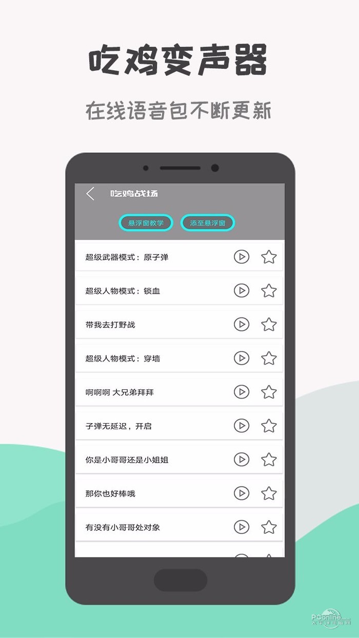#吃鸡变声器,内置多款语音包,如:吃鸡语音包、游戏语音包、群聊语音包、小哥哥语音包、小姐姐语音包等等,你可以在聊天、玩游戏、玩吃鸡的时候使用语音包来恶搞一下队友.