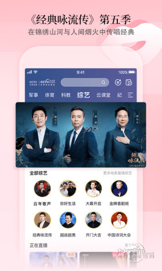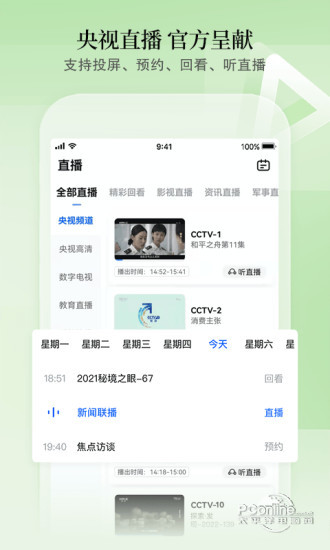 【CCTV手机电视,打开手机看电视】百路电视直播,海量央视独家及高清视频资源,从CCTV-1到CCTV-17,涵盖新闻、财经、体育、影视、娱乐、军事、科教、纪实、生活等领域;更有CHC动作影院、CCTV风云音乐、风云足球、风云剧场、世界地理、熊猫频道、魅力中国、CGTN等特色频道供您选择。提供直播节目预约、回看功能,支持一键投屏、倍速播放、音频播放,还可观看4K超高清、VR视频节目,精彩不容错过! 新闻资讯、相声小品、戏曲评书、有声书、广播等音频节目汇聚“听专区”。支持直播回听、音频收藏、后台播放功能,随时倾听品质之声。 【新闻资讯即刻知,热门节目畅快看】新闻直播间、朝闻天下、新闻联播、新闻1+1、焦点访谈、今日关注、防务新观察、军武零距离、中国电影报道、体坛快讯等权威专业内容,全球热点及时掌握!经典咏流传、中国诗词大会、百家讲坛、朗读者、等着我、今日说法、故事里的中国、天下足球、航拍中国、国家记忆、人生第一次等多档经典栏目,寓教于乐精彩无限!