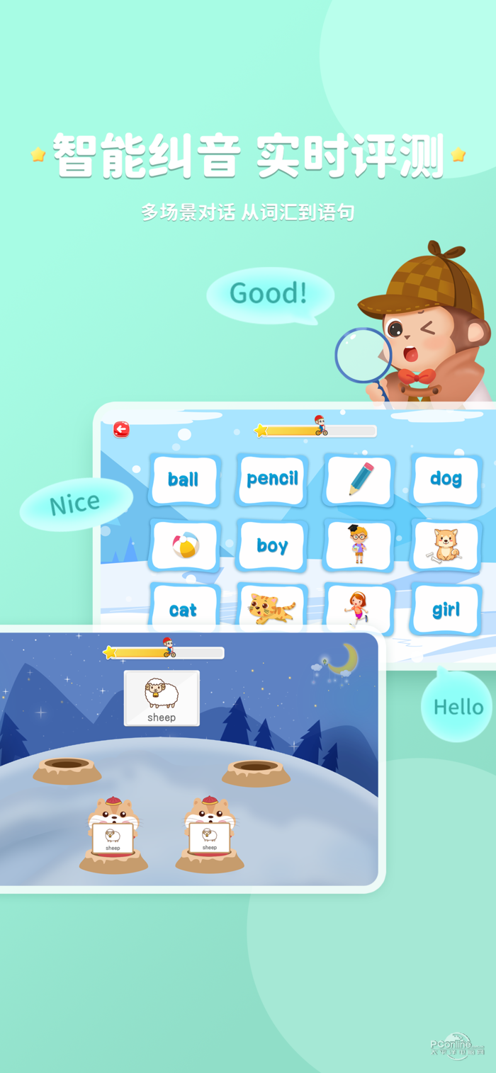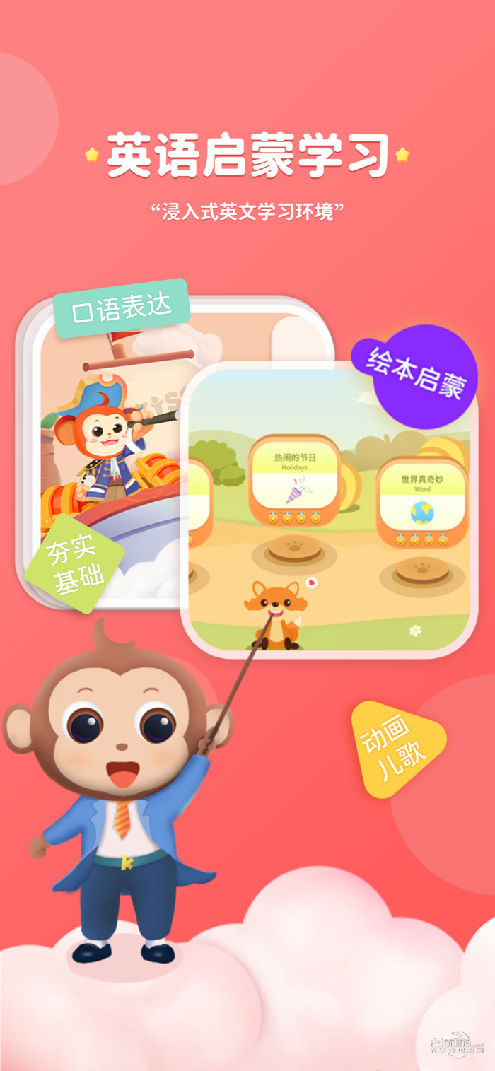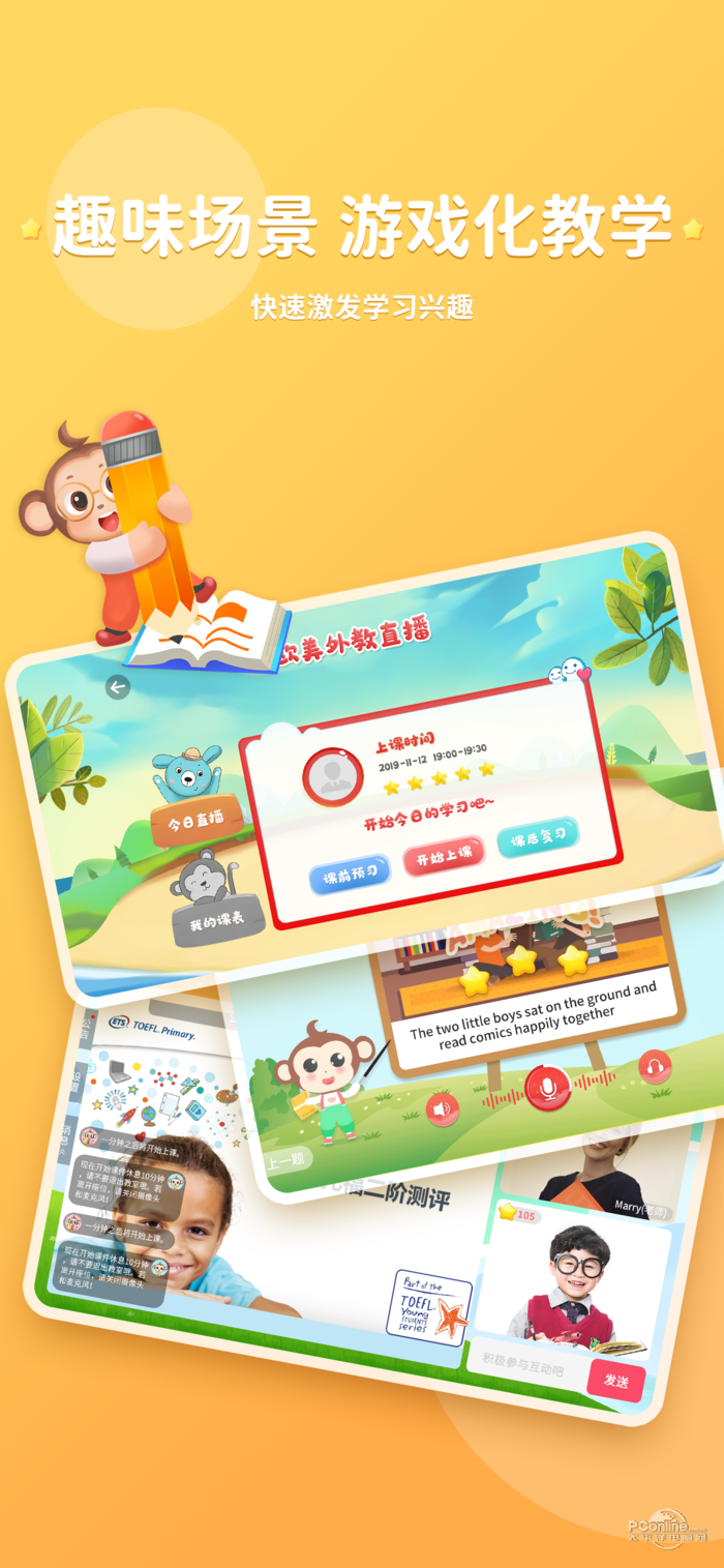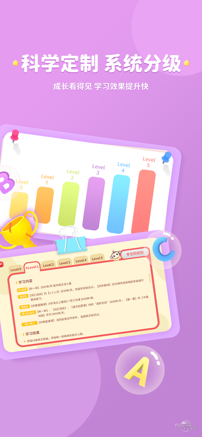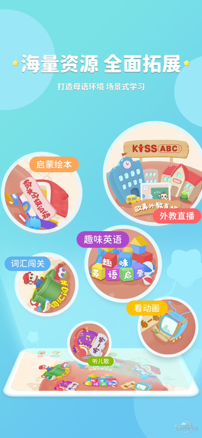 KISSABC英语学习训练系统融合13年在线教学经验,通过欧美外教直播栏目、趣味启蒙模仿栏目、分级阅读训练栏目 、趣味视频训练栏目、词汇闯关栏目和家长学习管理系统组成的一套全新的英语学习训练系统.KISSABC由百人教研团队匠心研发,结合国际知名语言学家提出“浸入式英文环境”学习方法.遵循孩童语言发展规律、认知能力阶段性特点,对课程进行精细化深耕.结合听觉、视觉、动作学习特点,设置好玩有趣的课程,增加用户学习的兴趣,鼓励孩子在小龄阶段语言黄金期”习得为主,学得为辅“,及后续大龄阶段语言提高期”学得+习得“同时并进,通过互联网教育打破英语学习困境.