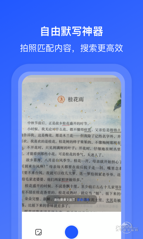 对要默写的内容进行拍照,APP帮助在互联网搜索并匹配内容,系统根据匹配的内容导出音频,学生听音频默写.支持中小学语文同步默写,使默写过程快捷高效.