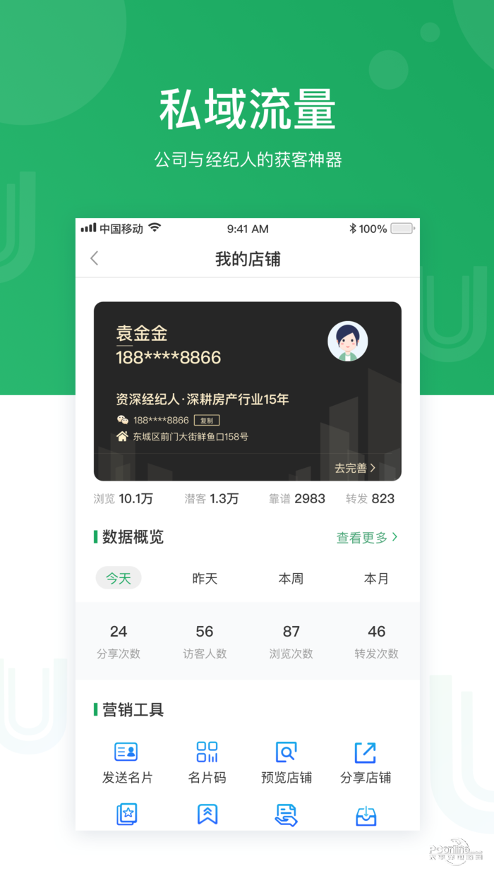 【外部赋能】一键同步58、幸福里、房天下等流量;超完善的分享工具;实时结算系统佣金;完善的权证售后体系等