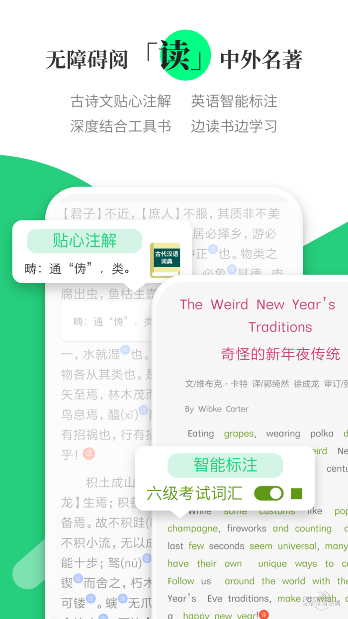 2. 融合权威工具书开发中外经典作品无障碍阅读服务,培养阅读能力: 包含汉语阅读、英语阅读两大栏目,收录中外经典作品.包含小学生必读书籍如《鲁滨孙漂流记》、经典古文如《庄子》,以及《西游记》等四大名著、《英语世界》杂志、《马克吐温短篇小说选》等世界名著.同时与工具书紧密融合,字词点击即查、古诗文注解及译文、英文阅读译文、智能标注分级字词和易错字词,实现无障碍阅读及智能标注,让你边读边学,在阅读中积累字词.