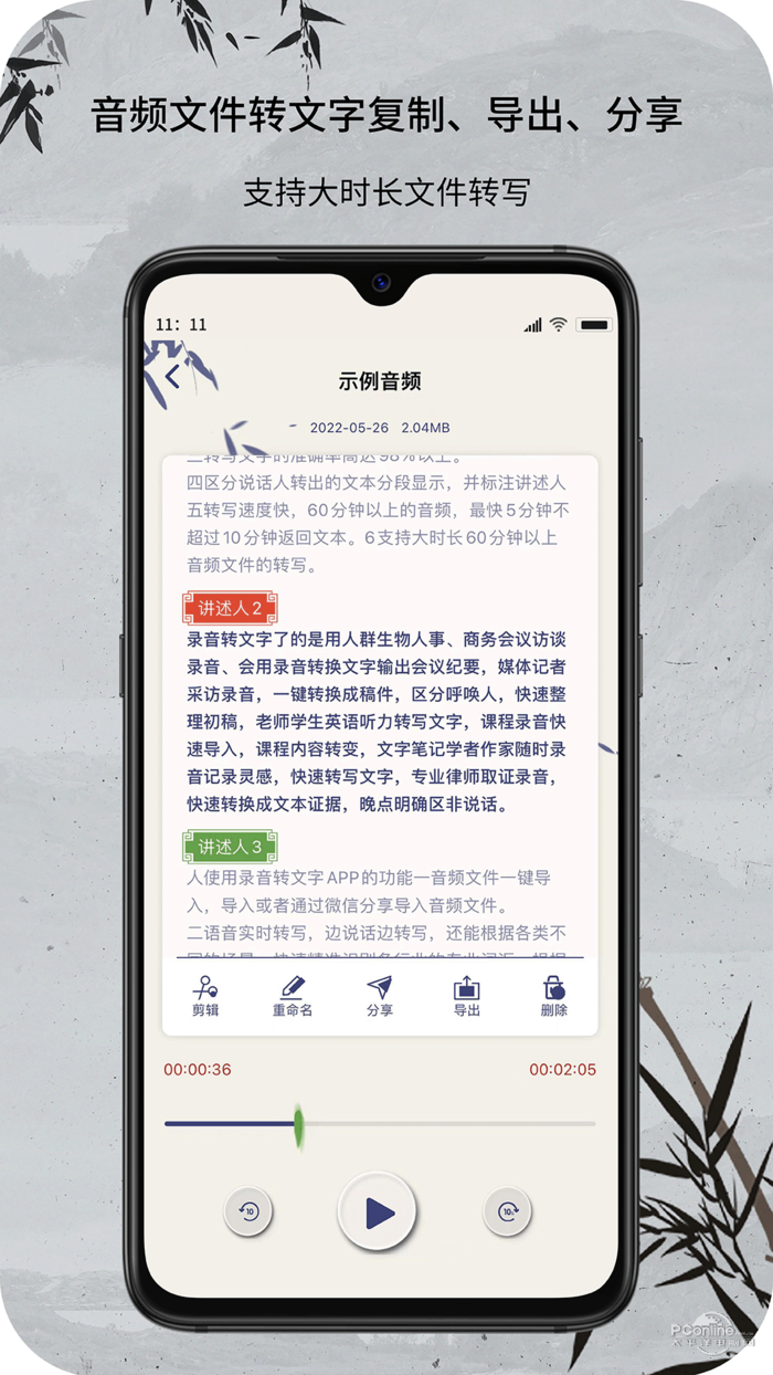 并且将音频转写成文字,文字可复制,并且可以导出文本内容以及分享.