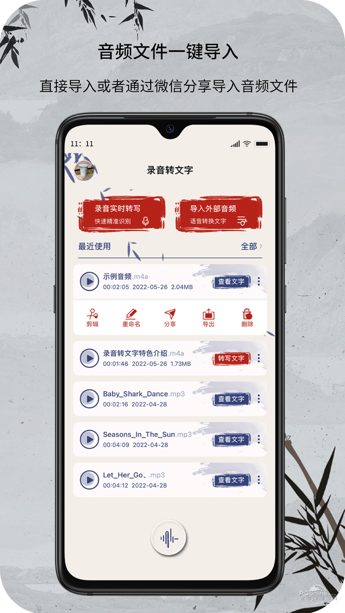 1.音频文件一键导入:导入或者通过微信分享导入音频文件