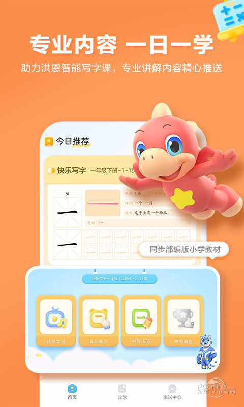 专业内容 一日一学:助力洪恩智能写字课,通过视频学习、互动练习、书写练习和书写报告等科学环节的设置,精心搭配专业的讲解内容,快乐学习每一天