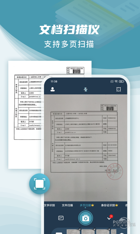 将摄像头对准文档,即可自动识别边界并拍出扫描件,多种文档色彩可供选择.