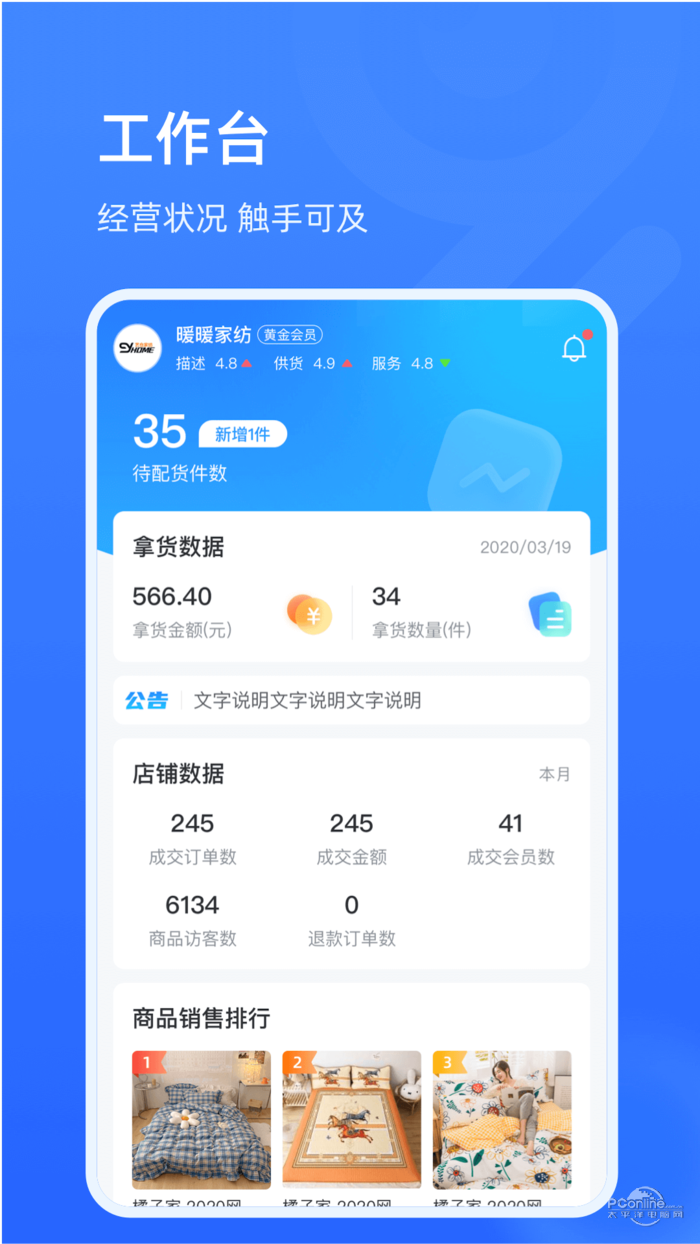 91家纺旺铺通,是一款针对91家纺网供货商家客户所适配的移动软件,具有查阅公告通知、待配货、成交订单、成交金额、成交会员、访客统计、退款退单、联系专属业务员等功能,聚焦“平台+会员”,旨在为91家纺网供货商家客户提供便捷、简单的服务体验.