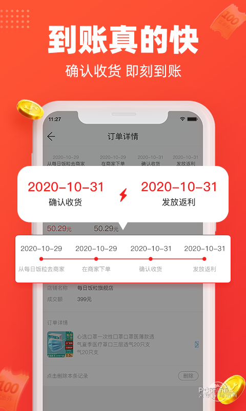 确认收货后,返利和红包,秒到账.一键提现即可到账支付宝或微信,没有套路、没有手续费、没有审核期.