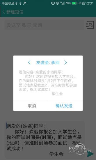 1. 一键群发内容不同短信:只需事先设置好备注名和备注内容即可一键群发短信,如 设置备注 (姓名):李四 (祝福语): 学业进步 编辑短信模板:(姓名),在此祝您(祝福语)! ,则收信方收到短信: 李四,在此祝您学业进步!