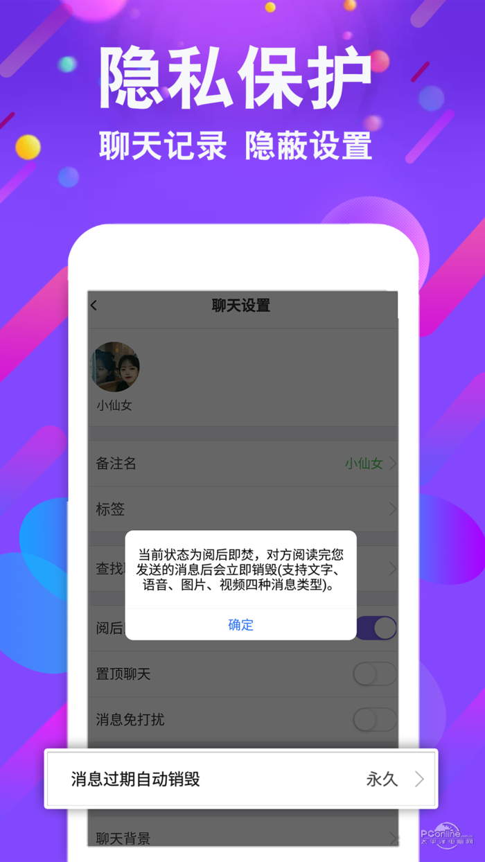 你可以设置申请查看功能,让不合眼缘的人无法看到你的资料,也可以设置阅后即焚,支持文字、语音、图片、视频四种消息类型,备注、黑名单设置,让隐私更安全更无忧