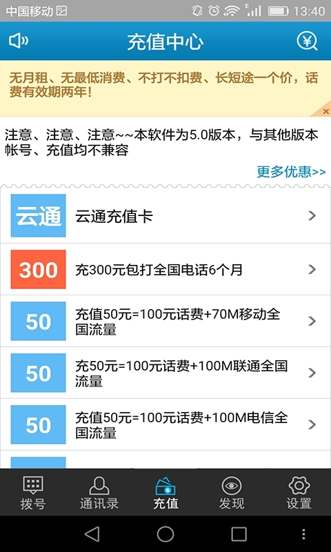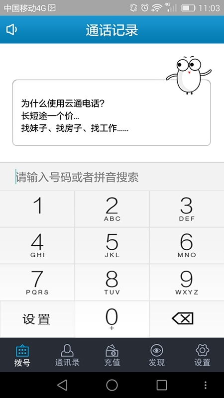 云通电话5.0版本,话费流量一卡双充,自由显隐号,直拨回拨任选,国内通话一个价,不分长短途,对方无需安装客户端,新用户注册有30分钟试用时长,快来体验一下清晰稳定的通话过程吧!