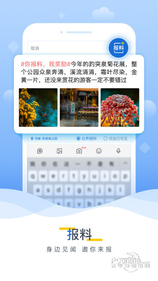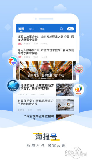 “海报”新闻客户端以“立足山东、全国一流”为目标,传播新热资讯,引领潮流生活,着力打造在全国具有强大传播力影响力、在行业具有重要话语主导权、在全省具有强大辐射带动作用的新型主流媒体。 权威发布:山东省内新闻发布出口,传播党委、政府声音,解读方针政策,汇集权威声音,回应公众热点。 海量资讯:国内国际一手掌握,身边精彩即时推发,全天候、全方位、全时段服务,新闻阅读快人一步。 移动直播:精准聚焦网络热点,新鲜视频一键直达,直播带你看新闻。 智能推送:融合大数据、可视化、人工智能等先进技术,主流信息与用户兴趣智能匹配、精准传播。 用户创造:开放共建,资源聚合,以“海报号”为依托推动用户创造鲜活内容。 乐享生活:便民搜索、实时缴费、高考查询,生活服务功能不断丰富;积分系统,用户动动手指就能赚积分、赢实惠。