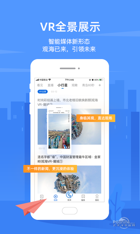 观海新闻APP是在中共青岛市委宣传部领导下,由青岛日报社(集团)倾力打造的一款区域性、现象级客户端.依托强大的泛内容原创能力,聚焦移动传播,以生态布局构建传播模式,建设智慧型、立体化、全开放、全交互、强体验的主流党媒传播阵地,立足青岛,面向胶东.