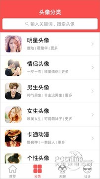 【个性】提供10大分类,200多个子类,分类清晰明确,快速定位自己的爱好。让你的头像与众不同,个性十足。