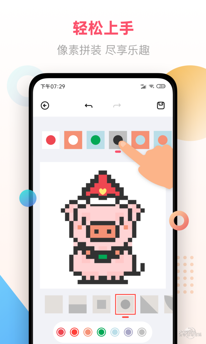 运用基本图形与色彩搭配组合,拖动或调整像素块即可轻松制作像素画,不需要绘画功底只要你有想法不管成人或小孩,都能创造出有趣、惊艳的作品.