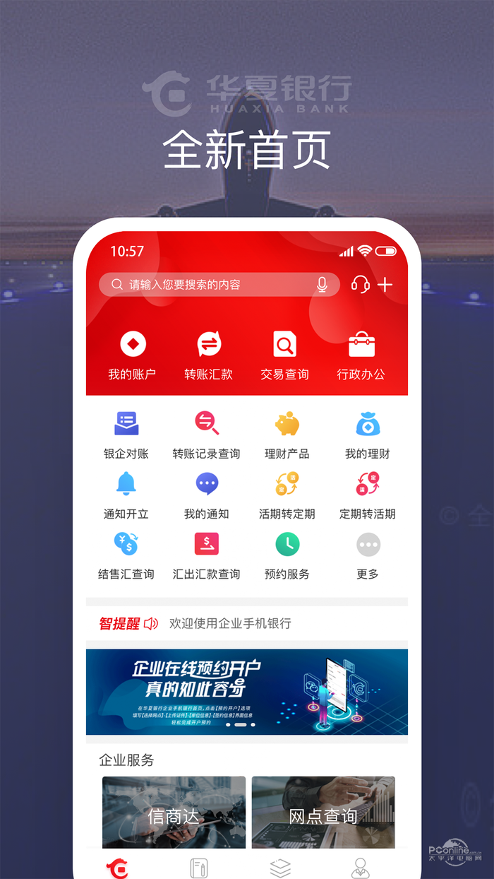 “华夏企业银行”提供转账汇款、银企对账、授权、存款、理财、预约开户、跨境金融查询、移动报销、移动签到等功能,还提供以大数据为基础的经营分析、信用报告、随行风控等增值功能,帮助中小企业在移动端便捷管理生意伙伴,拓宽生意圈,防范经营风险.
