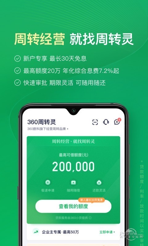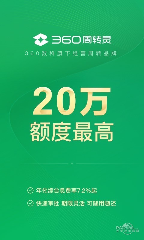 “360周转灵”是360数科官方出品的一款高额度、低利息、无抵押的信用贷款产品.利用人工智能和大数据风控技术,为用户提供方便、快捷、安心的借款服务.操作简便仅需三步,即可享受360数科为您提供的专属额度,随时解决燃眉之急.持续使用,还可不断提升个人额度以及获得用户成长鼓励.
