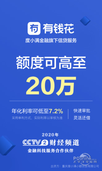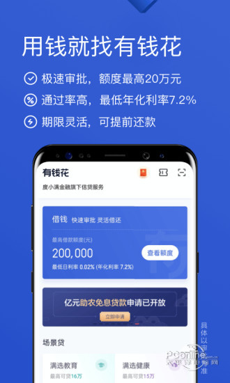 有钱花是度小满金融信贷服务品牌。有钱花app利用人工智能和大数据风控技术,有钱花下载app官方版是面向大众的互联网信贷服务平台,为用户提供方便、快捷、安心的贷款借款服务。仅需您填写身份信息,提交材料后快至30秒即可获得借款额度,额度高达200,000元,日息0.02%起,贷款借钱就找“有钱花”,随时借款提前还款无违约金,还可以灵活选择分期方式。