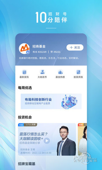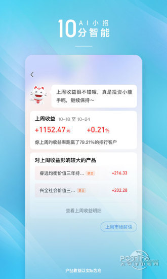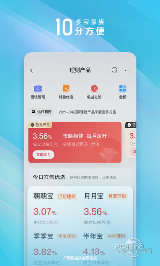更开放、更智能、更简单、更优质。梦想的,都10现。 ●招财号,10分陪伴。携手招商银行合作伙伴,开放讨论区、打造全新基金频道,陪伴你的财富旅程。 ●AI小招,10分智能。专业、有态度、全方位,不断进化的智能财富助理。 ●多宝家族,10分方便。月月宝、季季宝、半年宝,低风险策略,收益稳健。 ●融资体检,10分给力。综合评估资产负债情况,一站式融资服务。 ●招财分,10分成长。多维度解读资产配置,辅助投资决策。 ●智能账务中心,10分明了。提供多时间维度的收益数据,辅助投资收益总结与分析。 ●我的大学,10分活力。便利的高校功能,丰富的高校服务。 ●私行尊享版,10分专属。尊享服务全新升级,有温度。 ●长辈版,10分贴心。主要功能页面字号放大,提升易用性。 ●我的生活,10分周到。多项功能优化,新增优化i车一族、出行乘车码、社保查询、医保展码付等,更丰富。