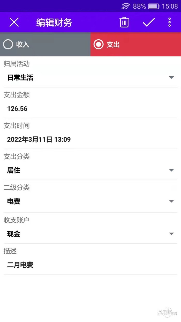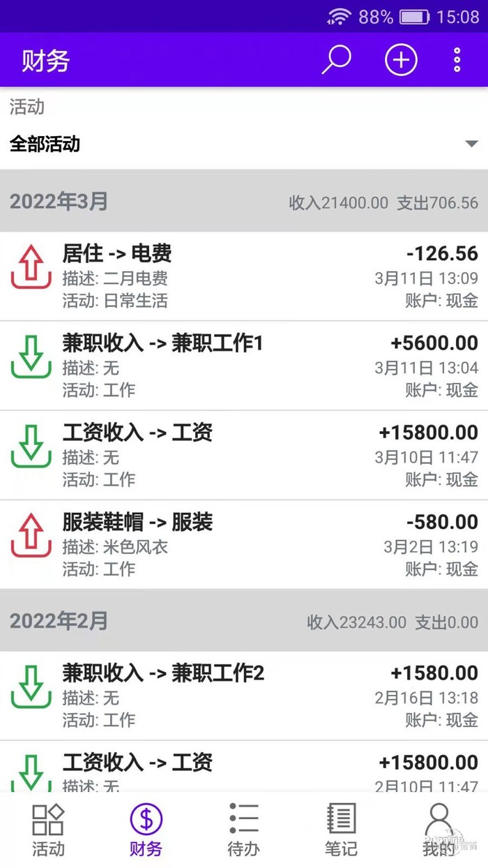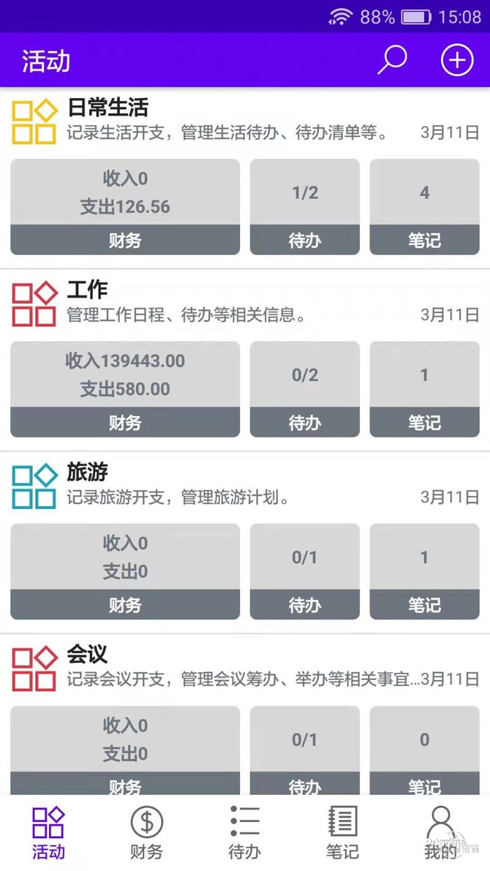 (3)创建活动,活动用于关联收入、支出、笔记、待办等.