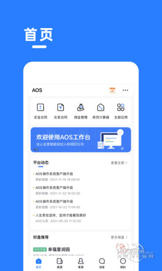 AOS(又名天下联盟)是搜房科技搭建的二手房经纪行业SaaS平台。为房产公司提供一站式综合服务,是经纪人的移动工作台,帮经纪人匹配精准购房者;汇集了房源发布和管理、客户管理、交易管理等功能于一体的综合平台。利用AI人工智能和云服务为房产公司和经纪人提供全方位、多角度的网络经济服务;构建界面友好、操作便捷、管理职能的全生态行业网络服务平台。