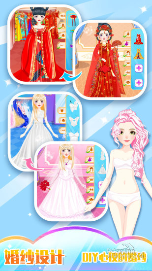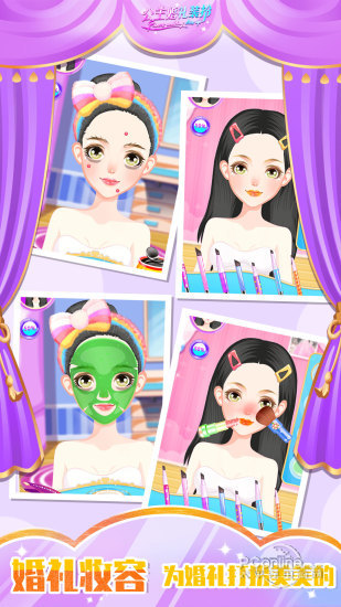公主要举行梦幻婚礼,需要一名设计师帮公主精心打扮,挑选婚纱,制作婚纱,装扮王子,制作蛋糕,装扮婚礼现场一起拍婚礼大片。 游戏流程丰富包括了,公主护肤,公主美妆,西式婚纱装扮,中式婚纱装扮,制作中西式婚纱,王子装扮,制作蛋糕,婚礼现场布置 护肤SPA:婚礼准备,帮助公主做一个护肤SPA,选择美丽的发型,做面膜,脸部清洁,染发,整个流程逼真有趣。 美妆:婚礼前需要给公主化一个漂亮的妆容,可爱的一字眉,闪亮的腮红,蓝色的美瞳,魅惑的眼影,五分钟速成烟熏妆!你可以随心妆扮 婚礼换装:各种风格的婚纱可以选择,百种服装配饰,轻松换装扮,创意,随心设计搭配!同时包括中西风格的婚纱可以选择。 婚纱制作:根据你自己的想法制作出你满意的中西式婚纱,经典的婚纱的款式可能就出自你的设计。 王子装扮:帮即将参加婚礼的王子穿上帅气的礼服,精致的领结,凸显出王子的风范和气质。 蛋糕制作:需要您亲手制作一个婚礼蛋糕,各种款式,颜色,装饰需要您来搭配。 婚礼现场:婚礼一定要隆重和气派,各种酷炫的效和布置需要你来选择。 一切精心准备之后,一期待已久的公主和王子的浪漫隆重的婚礼即将开始。