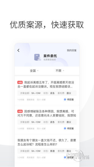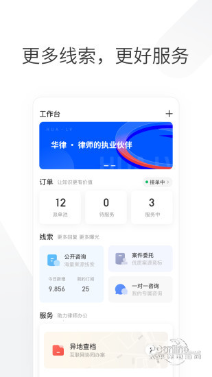 华律律师端是为律师打造的一款一站式移动办公软件,律师可通过该软件解答用户法律咨询,为用户提供专业的法律援助,提高律师办公效率。 1、快速为律师获取案源,高效链接用户。 2、开启接单服务,帮助律师获取快问订单。 3、多种智能法律工具设计,全方位提升工作效率。 4、操作快捷、服务消息及时处理,重要消息精准触达,随时随地解决用户法律问题。 5、律师名片分享,实现律师自我营销,帮助律师维护个人形象,通过自有渠道获取用户流量。