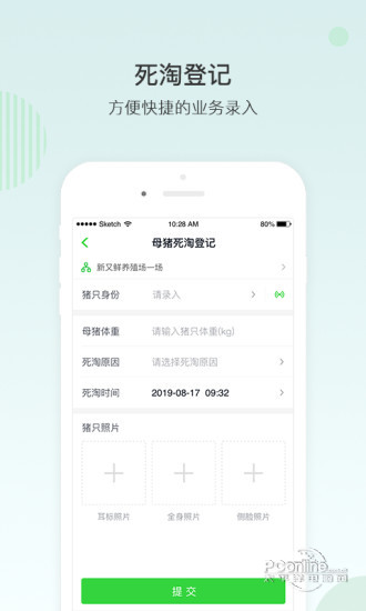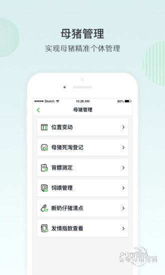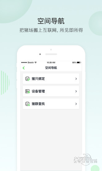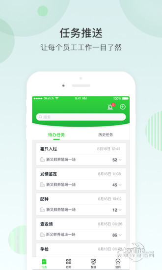 FPF未来猪场APP三大特色功能: 1、关联绑定 通过使用移动端APP,在猪场现场简单、快速建立设备、猪只、空间之间的相互关联,亦可根据猪场生产需求快速进行调整关联关系。可随时随地可视化的查看猪场的猪只、设备位置及情况。 2、任务导航 影子智能引擎依据猪只生产规律,自动推出的生产任务(发情鉴定、配种、查返情、孕检、待产、分娩、断奶、免疫、保健等),人员每天实时知道当天需要做的工作内容,并实时采集数据,确保工作不忘、数据及时准确。 3、报警管理:针对猪场猪只、设备、任务、指标、环境等的异常状况,进行预警和报警,并提供解决方案,系统和人工并举,及时发现问题、解决问题。