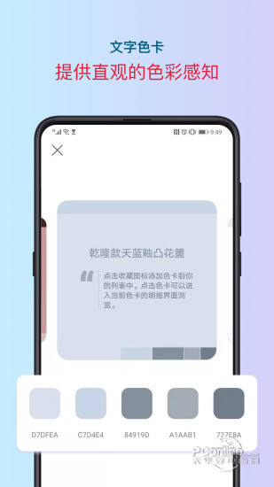 这是一款写给大家用的配色APP,无论你是配色初学者,还是专业设计师都能通过应用内提供的多种配色方式,寻找到配色灵感,并轻松搭配出好色彩。 ##功能介绍: ■ 相机实时配色,帮你捕获一闪而过的好配色; ■ 灵感探索配色,中西经典艺术作品和自然风光中提取的800多种原创配色; ■ 照片智能配色,从自己的相片中发现配色灵感; ■ 今日推荐配色,随心定制专属色卡库; ■ 手工编辑配色,hsb色值精准调节让你的配色更专业 ■ 记录分享配色,提供色值显示和复制把你的配色用起来 ##适用范围: ■ 手绘配色、海报配色、PPT配色、笔记配色、封面配色、家居配色、穿搭配色、 广告配色、网页配色、UI配色、刺绣配色、模型配色以及其他各类配色参考场景 ##应用特色: ■ 取色界面锁定和随机取色机制,让你roll出好配色; ■ 取色界面支持放大镜效果,让你抓住转瞬即逝的配色; ■ 持续更新的原创灵感色卡,每一张色卡都是开发者和设计师通过色采应用创建; ■ 便捷的色卡搜索,支持多种搜索方式,让你快速找到想要的配色 ■ 记录配色心情和灵感,留下专属配色记忆在你的帮助下,色采还可以做的更好。如果有任何建议,或者只是想和我们打个招呼,随时欢迎 :)