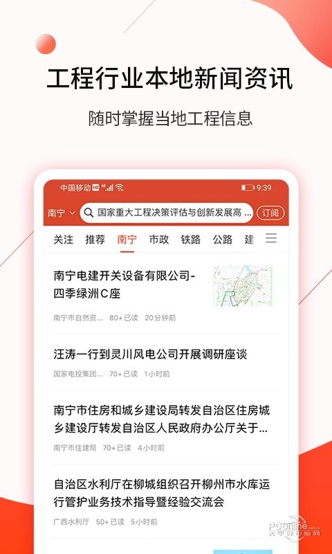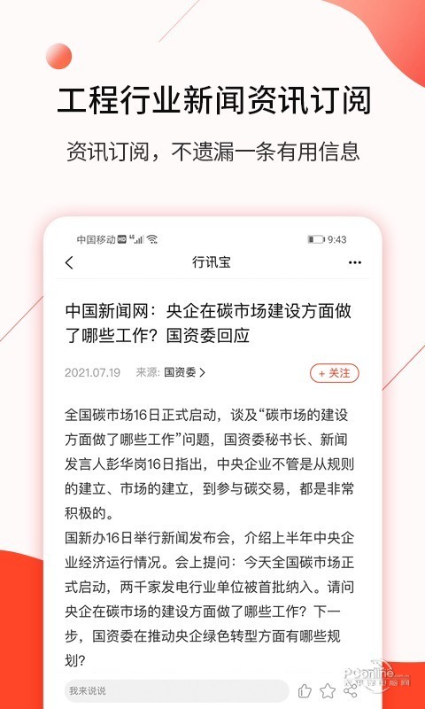 1、行讯宝APP首页:提供海量工程建设行业新闻资讯动态,您可关注和收藏特定领域、特定公司的资讯,系统会自动推送更多您关心的新闻资讯.