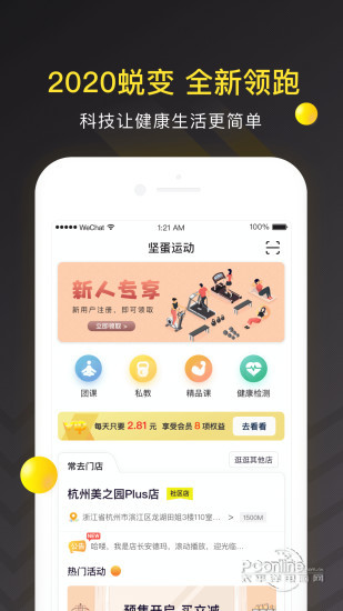 【坚蛋运动,科技让健康更简单】坚蛋运动是微柠科技旗下的一个数据驱动、场景创新的互联网智能健身平台,首创互联网+智能健身S2b2c新型社会化协同网络的商业模式,打造“月付139元”、 “社区型”、“24h运营”、“智能化”、“零推销”的智能健身房模式!2019年全国品牌布局25大省份,150+城市区域,2020年将覆盖全国市场,开业门店达200家。 核心特色:【附近门店查询,即刻健身】智能定位,为你推荐附近门店列表,打造15分钟健身圈,24小时健身房。【课程一键预约,省时省力】团操课程、精品课程一键预约,定时开课,颠覆传统选课模式。【私教信息透明,随心选择】私教信息全方位透明,简历、特长、评价、课程一览无余,总有一款适合你!【扫码进店健身,全程自助】 APP扫码进店、课程签到,全程自助,拒绝推销,只为健身。