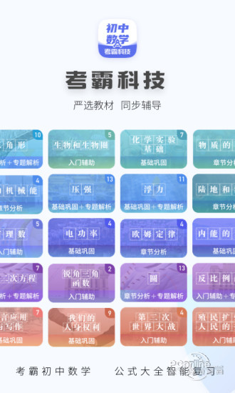 考霸科技【初中数学】轻松减轻家长负担,点燃孩子复习热情家长们放心,老师们安心,一份给孩子们的智能学习好助手!家长们都爱用的提分利器~ 合理规划碎片时间,减轻孩子们过重作业负担,在家不用家长辅导,就能自觉自主复习的提分利器考霸【初中数学】 家长们的放心选择【全科同步教辅资料】孩子作业不看不懂?工作忙没时间辅导??没有同步的教材详解???不用担心,我们统统有!!内涵数学知识公式大全,作业再不会查看公式解题思路,作业轻松搞定!无需空出时间,无需家长辅导,仅需下载考霸【初中数学】,同步的知识教材(人教版、北师版,多个版本),孩子课堂讲到那,打开软件复习到那,轻松完成预习、复习、巩固内容,搞定知识点,孩子学习没压力,家长看娃不焦虑~~ 深受老师们青睐的【千万级题库标准】严选历年考题、各地高频精题、甄选名校选题、总结考试错题汇集考霸科技精选题库;同步课堂、同步教材、同步章节,深受教师们的青睐,完善老师们选题的困难,智能搭配不同阶段的题型,作业布置更合理!